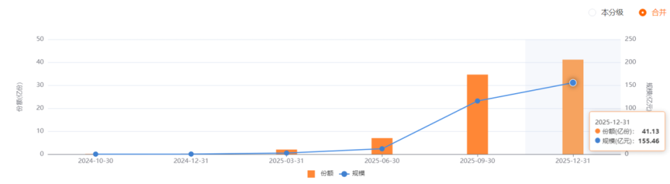 截至2025年末,该只基金合并规模已激增至154.6亿,环比三季度末增长了近40亿。基金份额也从三季度末的34.6亿份增长至41.1亿份,仍有大量基民涌入。