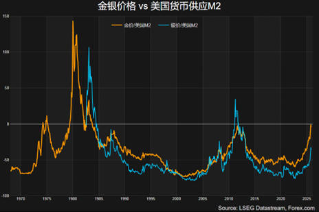 “相比于美国以及全球的货币供应(货币超发),当前黄金和白银的价格似乎还没达到极端水平。”Jerry Chen称。