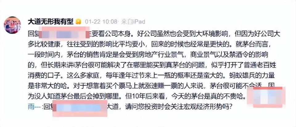 有网友向段永平提问:“投资时会关注宏观经济形势吗?”段永平表示,主要看公司本身。好公司虽然也会受到大环境影响,但因为好公司大多比较健康,往往受到的影响相对要小,回来的时候也经常是更快的。就茅台而言,一段时间内,茅台的销售肯定是会受到房地产行业等因素影响,但长期来讲i茅台很可能解决了在哪里能买到真茅台的问题,似乎打开了普通老百姓消费的口子。