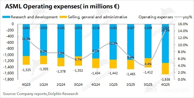 1.3 毛利及毛利率:阿斯麦(ASML)在 2025 年第四季度实现毛利 50.7 亿欧元,同比增长 5.8%。其中毛利率方面,公司本季度毛利率 52.2%,同比提升 0.5pct,符合公司指引区间(51-53%),主要是受价格较高的 EUV 收入占比提升的带动。