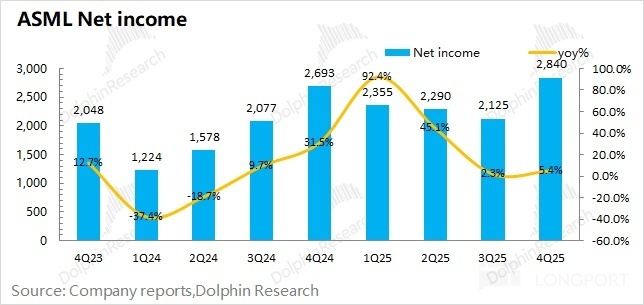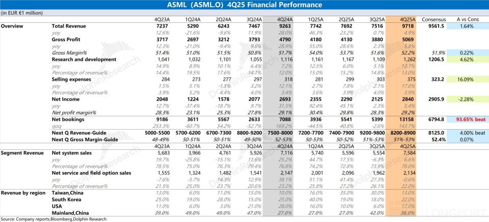 1.2 收入端:阿斯麦(ASML)在 2025 年第四季度实现营收 97.2 亿欧元,同比增长 5%,好于市场预期(95.5 亿欧元)。收入同比增长,主要来自于中国大陆地区客户贡献。