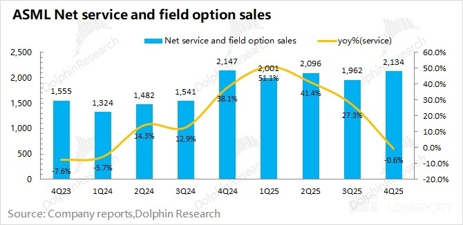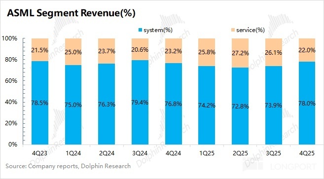 阿斯麦(ASML)的服务收入在 2025 年第四季度实现 21.3 亿欧元,同比下滑 0.6%。阿斯麦的服务收入,主要包括设备维护等项目,受行业周期影响较小。