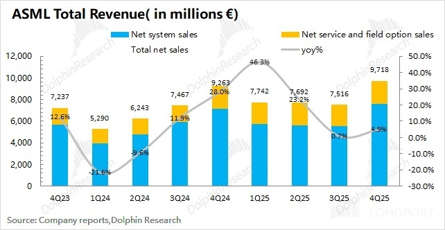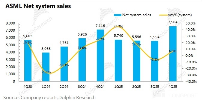 阿斯麦(ASML)的系统销售收入在 2025 年第四季度实现 75.8 亿欧元,同比增长 6.6%,其中本季度 EUV、ArFi 和 ArF Dry 等核心设备都有不同幅度的增长。