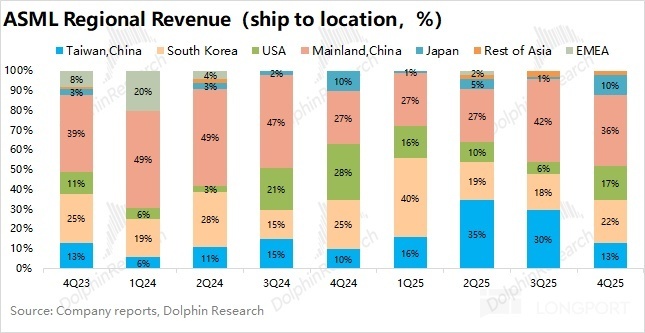 阿斯麦 ASML 本季度收入主要来自于中国台湾、中国大陆、韩国和美国,四者的合计收入占比达到 90% 左右。