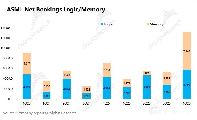 具体来看:①逻辑类订单:本季度为 58 亿欧元,环比增量 30 亿(符合季节性波动);②存储类订单:本季度为 74 亿欧元,环比增长 49 亿(远好于历史同期)。