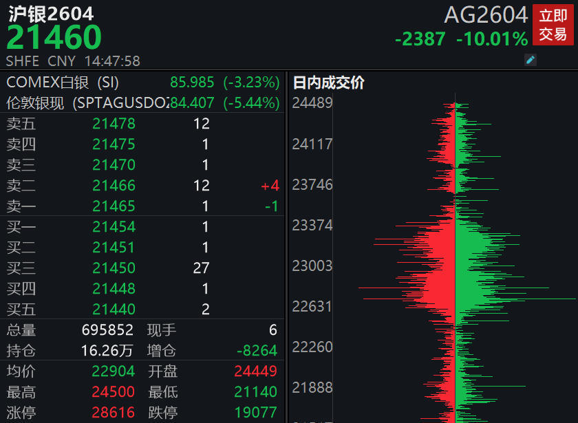 3日午后,沪银主力合约走低,临近国内商品期市收盘跌超10%;现货白银跌幅扩大至7%,失守84美元/盎司。