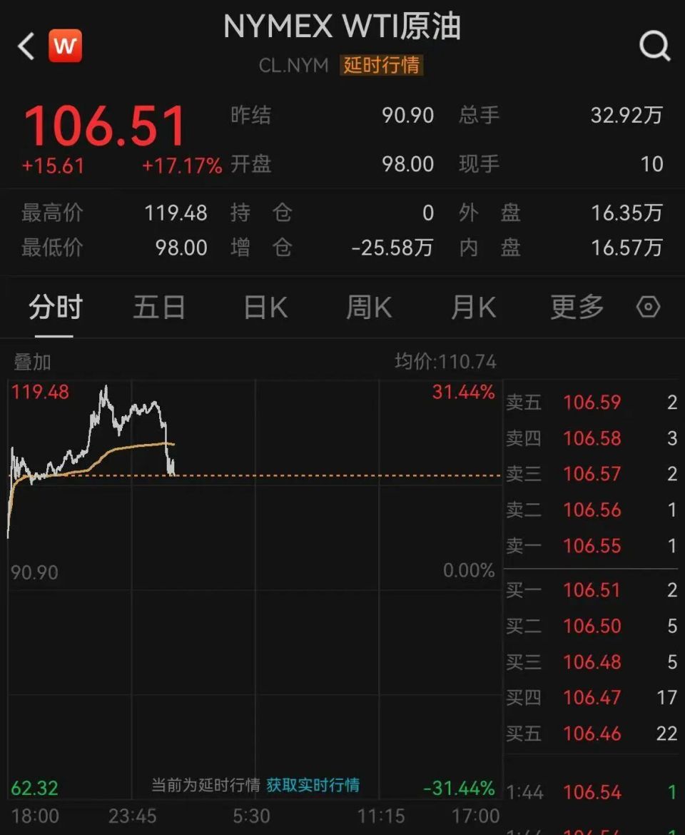 美以袭击伊朗进入第二周,波斯湾地区多个国家正陷入困境。投资者对石油生产和运输的恐慌情绪加剧,今日稍早,国际油价迅速冲上100美元大关后,自2022年6月以来首次逼近120美元。