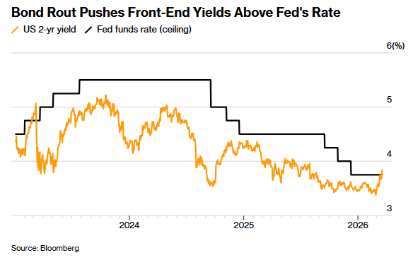 与此同时,上周两年期美国国债收益率突破了3.75%——一举刺穿了美联储官员当前设定的联邦基金利率目标区间的上限。截至上周五收盘,该期限美债收益率收于约3.89%——这是自去年7月以来收盘时的最高水平。