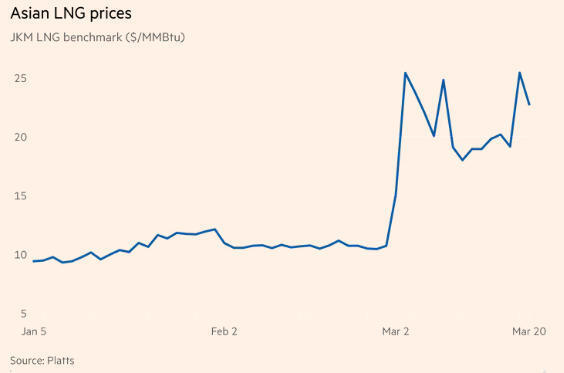 3月22日,英国《金融时报》发出预警:随着最后几艘来自海湾地区的运输船抵达目的地,未来10天内,该地区液化天然气(LNG)供应将突然中断,全球处于天然气断供边缘。