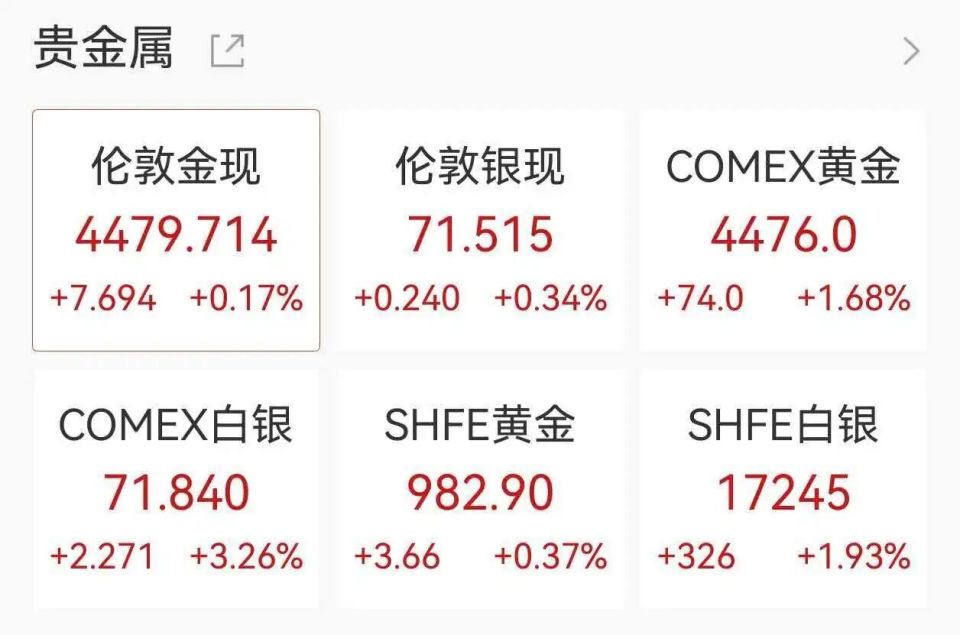 3月25日亚太早盘,贵金属走高,截至北京时间7:08,现货黄金涨0.17%报4479.714美元/盎司,现货白银涨0.34%报71.515美元/盎司。