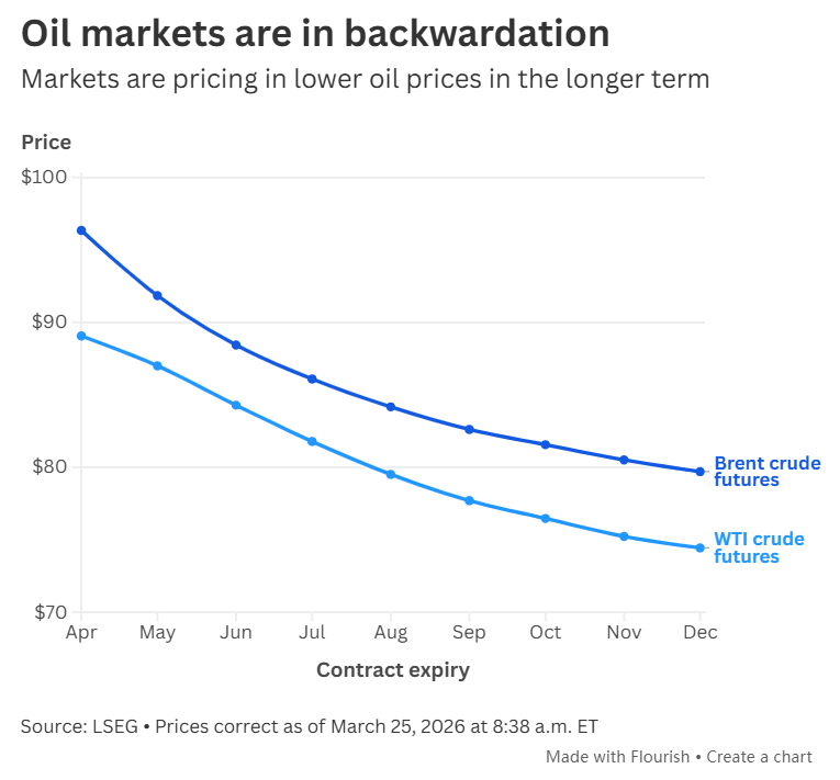 财联社3月26日讯(编辑 卞纯)自美伊战争爆发以来,国际油市持续震荡。分析师指出,油市目前已进入“现货溢价”(backwardation)状态,表明交易员预期美伊冲突将快速得到解决,且风险溢价已被计入能源价格中。