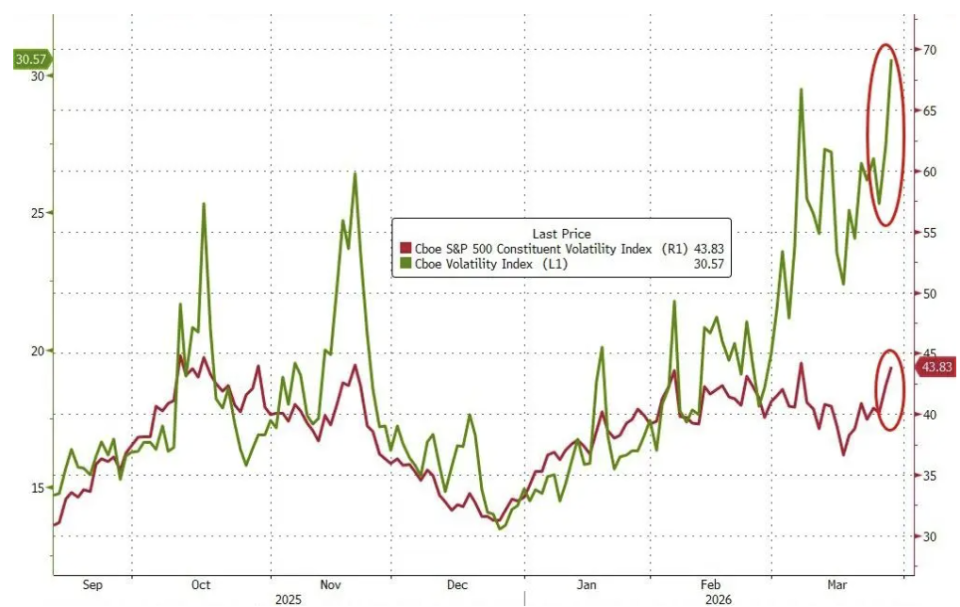 情绪指标同样发出警报。Cboe波动率指数(VIX)周五升破31,远高于约20的长期均值。据Citadel Securities数据,针对标普500指数进一步下行的看跌期权需求大幅跳升,衡量市场偏态的"skew"指标已升至近五年来的高位区间。