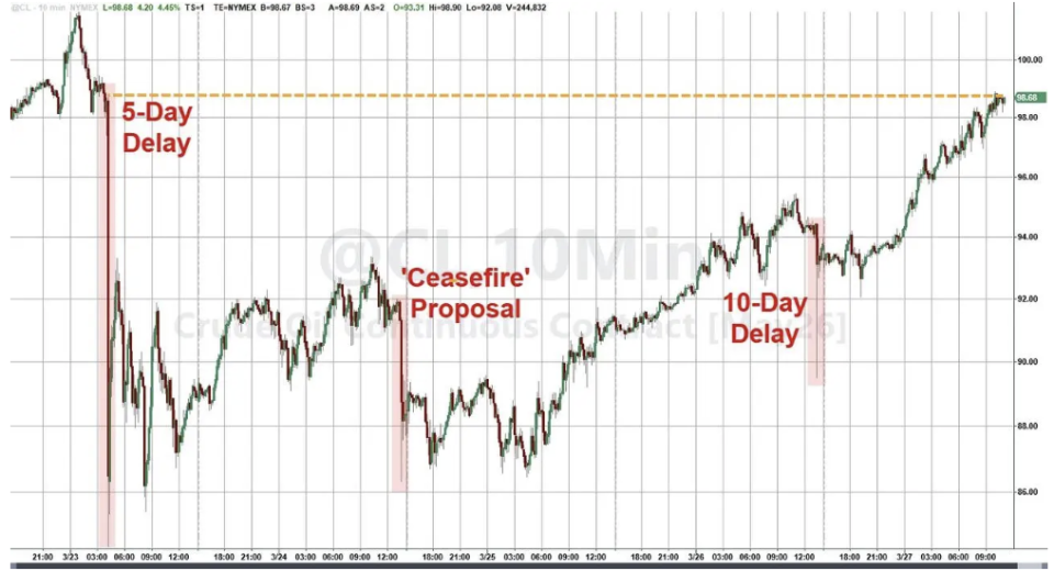 尽管特朗普三次试图通过口头干预压低油价(5天延期、“停火”提议和10天延期),WTI原油本周依然收平,价格涨至特朗普口头干预之前的价格水平。