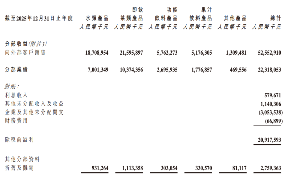 功能饮料板块2025年实现营收57.62亿元,同比增长16.8%,占公司营业收入的10.96%;果汁饮料营收51.76亿元,较上年同期增长26.7%,占公司营业收入的9.85%。