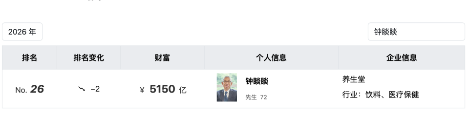 2026年3月,胡润研究院发布的全球富豪榜显示,72岁的钟睒睒以5150亿元财富位列中国企业家第二位,财富同比增长35%。