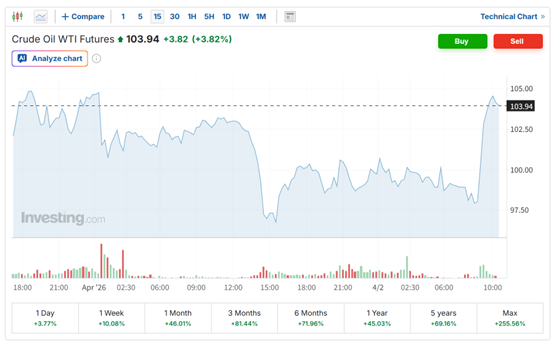 油价大幅上涨。截至目前,美国西德克萨斯中质(WTI)原油期货价格上涨3.82%,至每桶103.94美元。国际基准布伦特原油价格上涨4.61%,至每桶105.82美元。