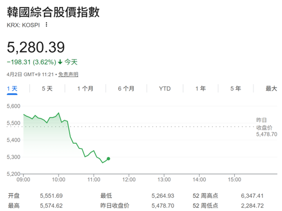 亚太股市由涨转跌,日韩股市领跌。日经225指数开盘上涨0.61%,截至发稿,跌幅为1.77%,报52786.23点。韩国综合指数高开1.3%,截至发稿,下跌3.62%,报5280.39点。