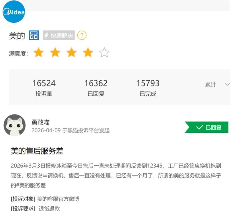 ▲ 美的售后相关平台投诉情况(来源:黑猫投诉平台)
