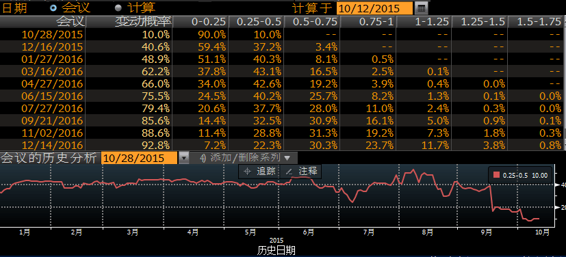 12月联邦基金利率期货显示美联储加息的可能性接近40%。彭博行业研究经济学家认为,无论即将出台的经济消息是何基调,都可以肯定美联储不会在10月份的FOMC会议上加息。