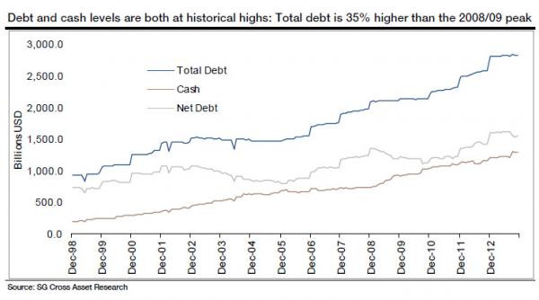 正如我们在2014年1月最初论断的那样,事实在于,所有关于“核心”资产负债表,创历史的现金缓冲的讨论都说明,美国企业债务的增长已经超过了现金的增加。事实上,在2014年初时,美国企业债务比其前期峰值还高出35%,这里是指净债务。