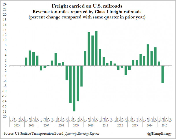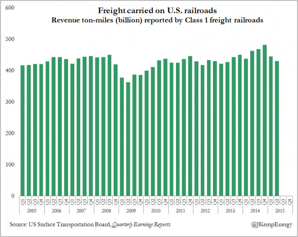运往发电厂的煤炭,是美国铁路货运网络中最大的大宗商品,占到全部货运量的大约三分之一。但受到环境法规和低汽油价格的影响,煤炭货运量第二季度同比下降2700万吨,跌幅约为15%。