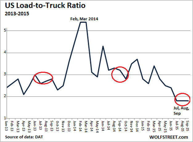 今年的9月相比于辉煌的2014年9月显得非常糟糕。甚至与2013年9月的情况相比也是惨不忍睹。DAT数据分析师Montague表示,需求的大幅下滑给货运卡车装载率带来巨大打击。
