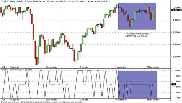 Harris写道:“似乎除了年初时连续29日没有连续2日上涨之外,其余的超过23日的情况市场都出现了跌势或者大幅修正。始终无法‘两连阳’不太会在牛市中出现。”