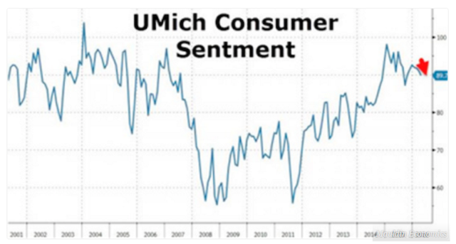 消费者信心大减。消费者信心快速下滑,它对于以消费带动经济发展的美国而言的确是一个糟糕的迹象。