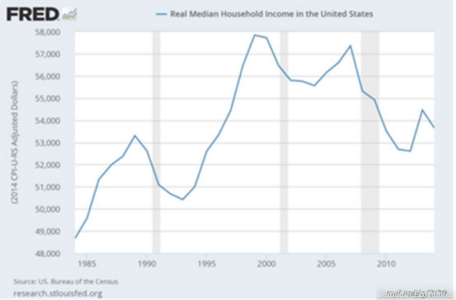 薪酬缩水。问题的根源是薪酬缩水或者工资减少。现实情况是经通胀调整后的薪酬缩水,尽管最近几个月几个州的最低工资已经增加。