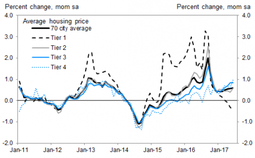 对于中国国内大城市和中小城市价格轨迹的急剧蔓延,Gavekal Dragonomics公司的房地产经济学家Rosealea Yao向路透社表示:“销售下降在大城市中是相当重要的,所以房地产价格肯定不会反弹。价格轻微下降的趋势至少将会持续到2018年上半年。”