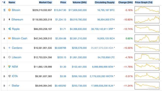 消息公布后,包括比特币、以太坊在内的加密货币全线下跌。比特币三大交易平台Bitstamp、Bitfinex和GDAX报价纷纷跌破13000美元关口,日内跌逾12%。