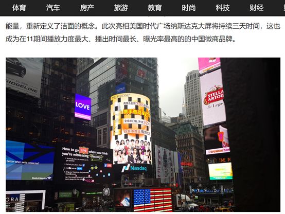 每经小编(微信号:nbdnews)注意到,近几年来,时代广场的中文广告数量激增,“画风”突变。很多中小品牌、微商甚至明星粉丝都争相露脸。“XX太牛了,登陆纽约时代广场,给中国人争面子了!”,这样的营销文案也曾刷屏朋友圈。