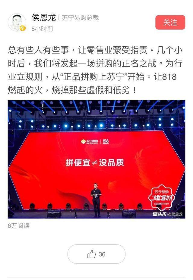 8月7日晚,苏宁易购总裁侯恩龙将炮火对准了拼多多。在个人社交账号上表示,苏宁将发力拼团购物模式,并配上一张“拼便宜不等于没品质”的图。“总有些人有些事,让零售业蒙受指责。几个小时后,我们将发起一场拼购的正名之战”、“烧掉那些虚假和低劣。”