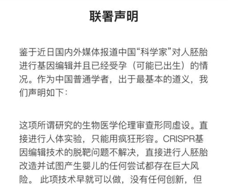 26日晚间,来自斯坦福、麻省理工、中科院、北大等海内外顶尖机构的122位中国科学家发布联署声明,强烈谴责贺建奎贸然对可遗传的人体胚胎基因做任何编辑尝试。声明中称:这项所谓研究的生物医学伦理审查形同虚设,直接进行人体实验,只能用疯狂形容。