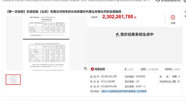 澎湃新闻记者从阿里司法拍卖网站了解到,1月8日上午10时,乐视控股(北京)有限公司持有的北京财富时代置业有限公司的全部股权公开拍卖结束出炉。
