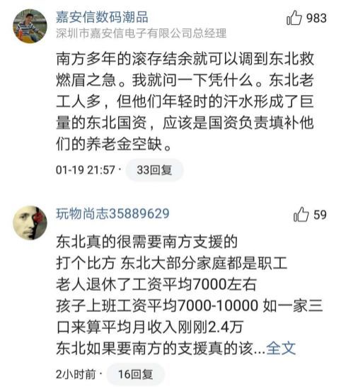 也有网友认为:东北老工人多,但他们年轻时的汗水形成了巨量的东北国资,应该是国资负责填补他们的养老金空缺。