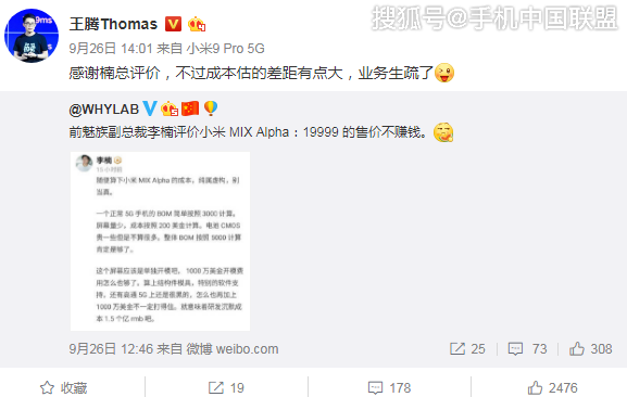 5.王腾回应李楠分析MIX Alpha成本:此前魅族前高管李楠分析了小米MIX Alpha成本,他认为该机的售价要低于成本,对此小米产品总监王腾回应说感谢楠总评价,不过成本估的差距有点大,业务生疏了。