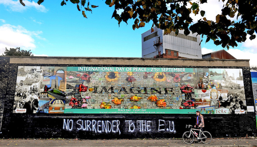 资料图:北爱首府贝尔法斯特和平墙上的涂鸦,标语写着不向欧盟屈服。