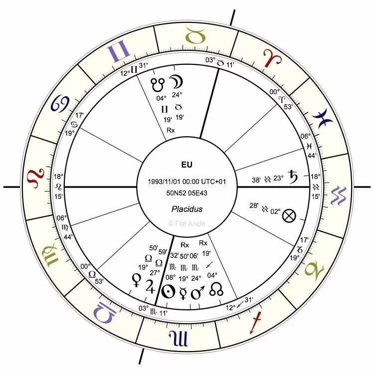 火星在24度天蝎,月亮在24度金牛,土星在23度水瓶。大家可以看到固定星座的23-24是欧盟星图的敏感点。只要有行进的星体经过这个敏感点,就会触动月亮-火星-土星的固定星座T三角。
