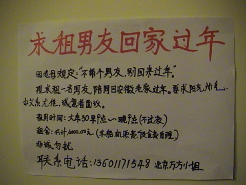 女生万元求租北大男生过年
