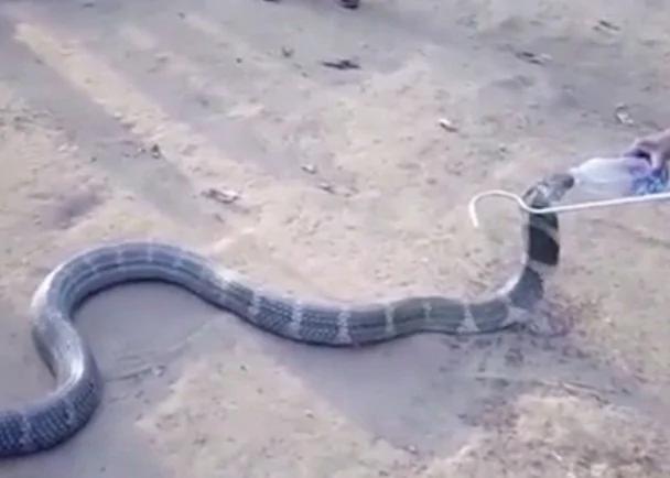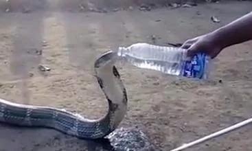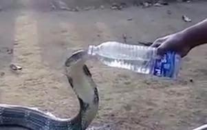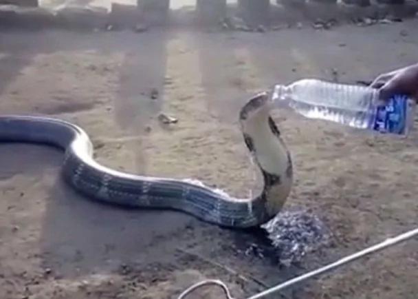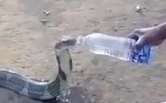 印度一条眼镜王蛇在旱灾下,闯入村子找水喝。期间,得到救援人员拿着水瓶,喂它喝水。