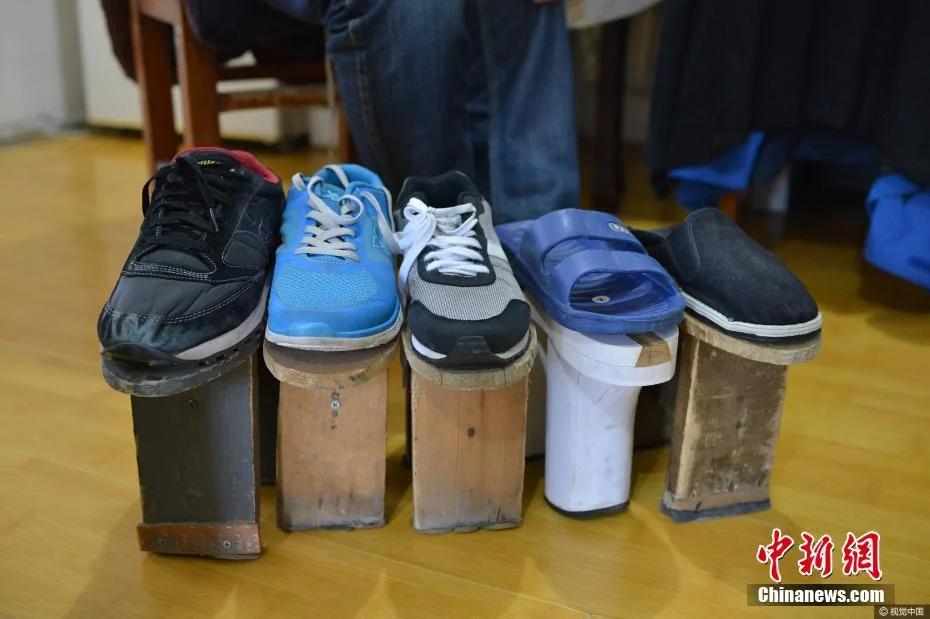 为了保持平衡,他左脚穿的是自制的“板凳鞋”,一眼看去,就像脚底下踩着一只板凳。这种特殊的“板凳鞋”,赵强已经穿了整整17年。