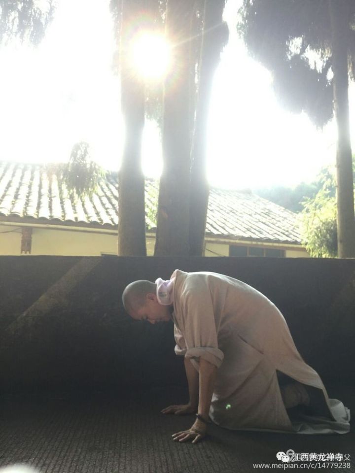 她每天早上3:50起床,礼佛1000拜,忏悔往昔恶业;然后随大众上殿做早课,早斋后,自己发心诵经,并回向给有意无意伤害过的众生。白天,去斋堂发心;寺院内外的卫生,脏活累活抢着做。晚上回寮听开示或抄经或打坐。她坚持:除特殊情况外,绝不把时间浪费在任何无意义的事情上。