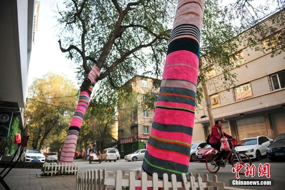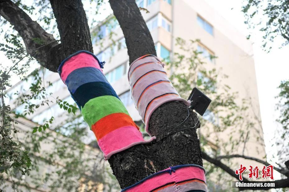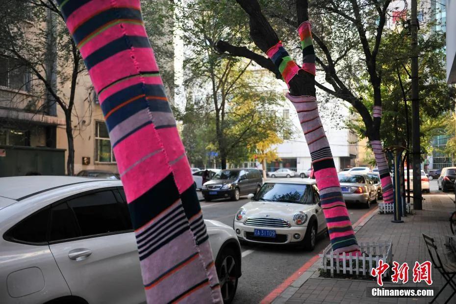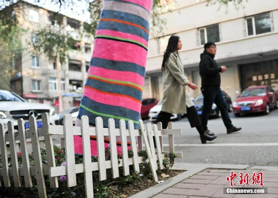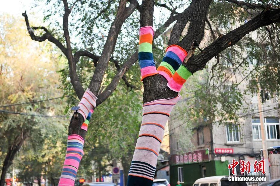 10月24日,随着沈阳天气渐渐转凉,沈阳市街头3棵大树树干上被粉、红、绿等彩虹色的毛线布包裹起来,好像是给大树穿上一条“秋裤”,让人眼前一亮。