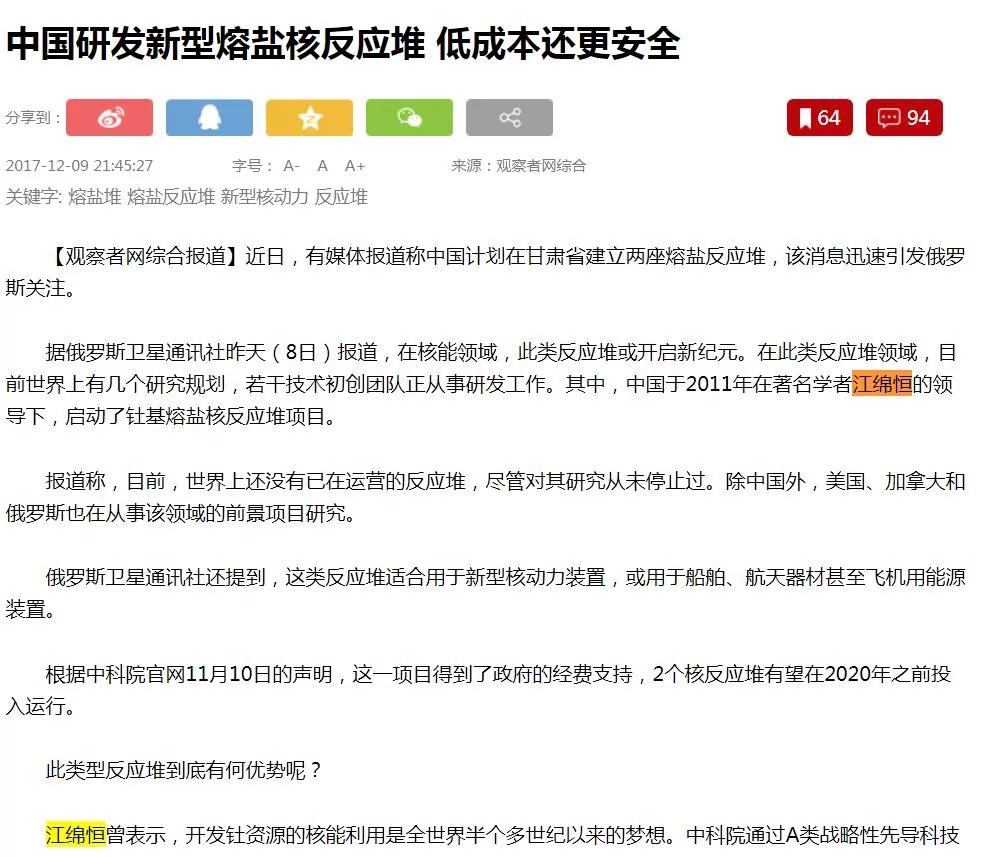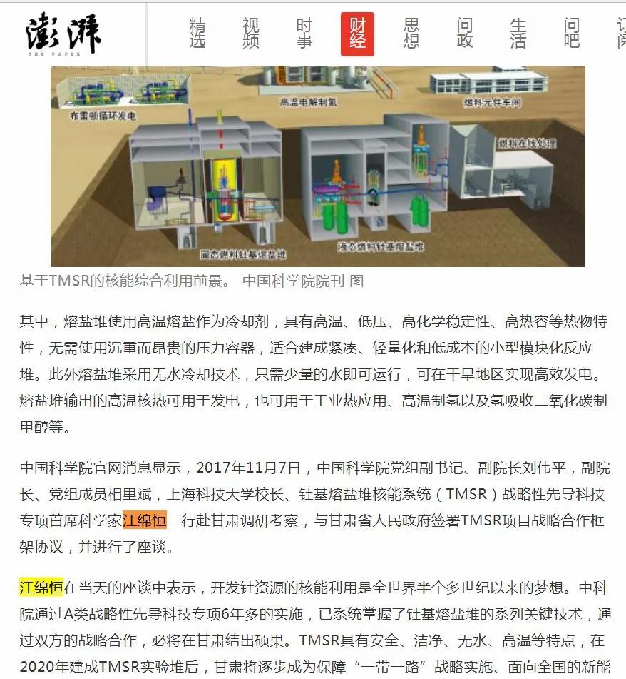事实上,去年12月陆媒观察者在“中国研发新型熔盐核反应堆”的相关报导中就提及,