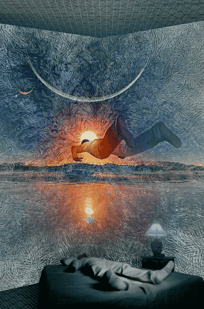 对于许多清醒梦者,或者说“梦境宇航员”(oneironaut)而言,内心世界和外部世界合而为一。在清醒梦降临时,克莱尔·约翰逊(Clare Johnson)会从当下的梦境一个后空翻跳出来,降落到一片无限的虚空并欣喜不已。费利西蒂·道尔(Felicity Doyle)则常常以探索一个“肥皂泡”星系开始,每一个泡泡都是一扇异世界的门户。另一个男性召唤了一个宇宙,但由于他要分享的内容比较敏感,选择了使用假名。我们就叫他利亚姆(Liam)吧。他的妻子无比信任地睡在身旁,他却在做着清醒梦,并将两个最常见的清醒梦主题相结合:他飞过一个由无数诱人星球组成的宇宙,搜寻着性爱。