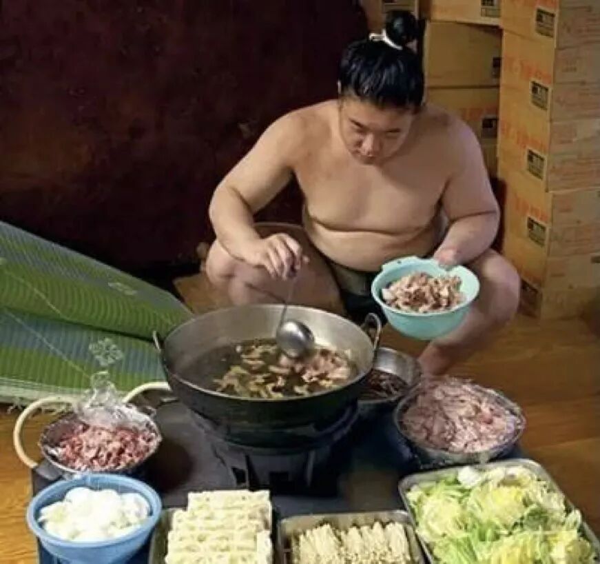 相扑手每天要进食大量的米饭和炖肉来达到壮肥的体形。他们经常吃一种多样高营养食物一锅煮的火锅——称之为“相扑火锅”(ちゃんこ鍋)。
