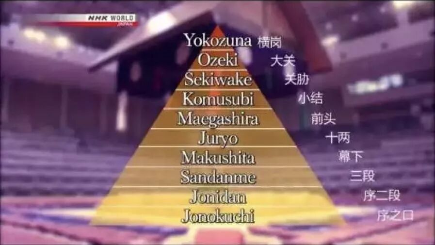 相扑手按比赛成绩,分为十个等级:序之口、序二段、三段、幕下、十两、前头、小结、关胁、大关、横纲。十两以上的相扑手称为“力士”,成为职业相扑手,有不菲的工资收入。“横纲”则是相扑手的最高段位,从某种意义上来说可以算是终身荣誉称号。