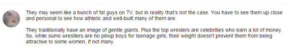 △ 这些相扑运动员在电视上看起来可能油腻而肥胖,但现实中并非如此。他们的肥胖跟懒不同,他们的肥胖精心打造,不仅身材高大,而且还很温柔。再加上事业上的成功,所以虽然身材并不健美,但并不妨碍小姑娘们的疯狂追求。
