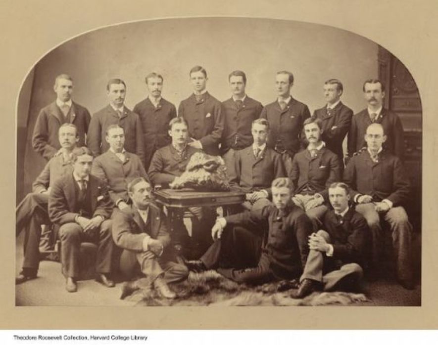 △ 1880年的玻斯廉俱乐部成员,木桌右边席地而坐的是大学时期的美国第26任总统罗斯福